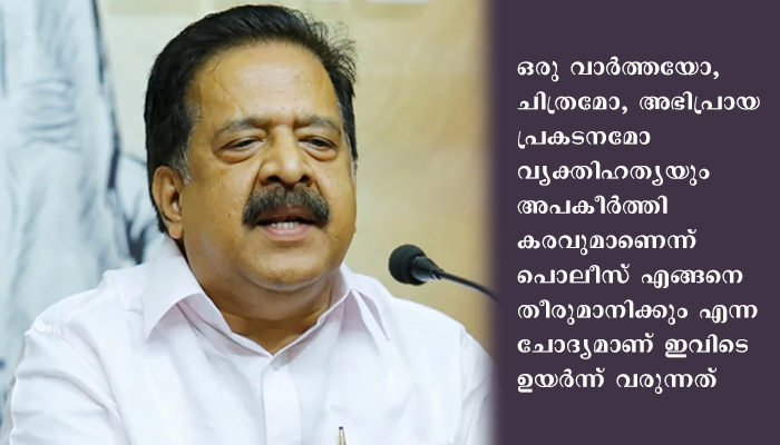 സാമൂഹ്യ, വാര്ത്താമാധ്യമങ്ങളിലൂടെ വ്യക്തികളെ അപകീര്ത്തിപ്പെടുത്തിയാല് അഞ്ച് വര്ഷം വരെ തടവ് ശിക്ഷയും പതിനായിരം രൂപവരെ പിഴയും ലഭിക്കാവുന്ന വിധത്തിലാണ് കേരളാ പൊലീസ് ആക്റ്റില് ഭേദഗതിയിലുള്ളത്. ഇത് ഇന്ത്യന് ഭരണഘടന ഉറപ്പ് നല്കന്ന പൗരാവകാശങ്ങളുടെ ലംഘനമാണെന്ന് ചെന്നിത്തല വിമര്ശിച്ചു.