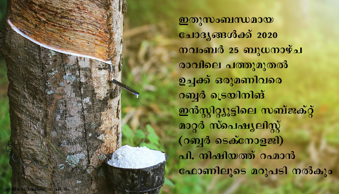 റബ്ബറുത്പന്നനിര്മ്മാണം – പരിശീലനപരിപാടികളെക്കുറിച്ചറിയാന് കോള്സെന്ററില് വിളിക്കാം