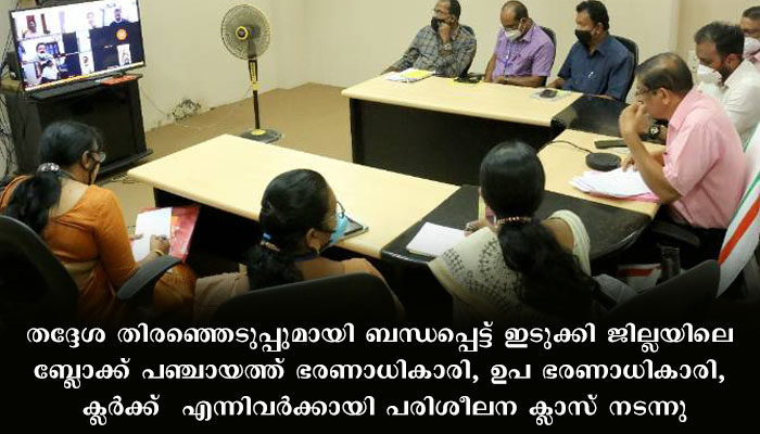 ബ്ലോക്ക് തല പരിശീലന ശേഷം ജില്ലയിലെ ഗ്രാമ പഞ്ചായത്ത് വരണാധികാരികള്ക്ക് വീഡിയോ കോണ്ഫറന്സ് വഴി ജില്ലാ കളക്ടര് ഇലക്ഷന് സംബന്ധിച്ച് ആവശ്യമായ നിര്ദ്ദേശങ്ങള് നല്കി. സബ് കളക്ടര് പ്രേം കൃഷ്ണ, എ ഡി എം ആന്റണി സ്കറിയ, ഇലക്ഷന് ഡെപ്യൂട്ടി കളക്ടര് സാജന് വി.കുര്യാക്കോസ്, ബ്ലോക്ക്തല വരണാധികാരികള്, ഉദ്യോഗസ്ഥര് തുടങ്ങിയവര് പങ്കെടുത്തു.