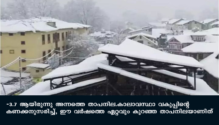ശ്രീനഗര്‍: കശ്മീരില്‍ സീസണിലെ ഏറ്റവും തണുപ്പുള്ള രാത്രി നവംബര്‍ 21ലെ രാത്രിയായിരുന്നുവെന്ന് റിപ്പോര്‍ട്ട്.-3.7 ആയിരുന്നു അന്നത്തെ താപനില.കാലാവസ്ഥാ വകുപ്പിന്റെ കണക്കനുസരിച്ച്, ഈ വര്‍ഷത്തെ ഏറ്റവും കുറഞ്ഞ താപനിലയാണിത്. താപനില കുറയുന്നത് കശ്മീര്‍ താഴ്വരയിലെ ആളുകളുടെ ജീവിതത്തെയും ബാധിച്ച് തുടങ്ങിയിട്ടുണ്ട്. താപനില മൈനസ് 7.4 ഡിഗ്രി സെല്‍ഷ്യസായി കുറഞ്ഞ പ്രശസ്തമായ സ്‌കീ റിസോര്‍ട്ടായ ഗുല്‍മാര്‍ഗാണ് കശ്മീര്‍ താഴ്വരയിലെ ഏറ്റവും തണുപ്പുള്ള സ്ഥലം.താഴ്വരയിലെ പ്രശസ്തമായ വിനോദസഞ്ചാര കേന്ദ്രമായ പഹല്‍ഗാമില്‍ മൈനസ് 5.6 ആണ് തണുപ്പ്. കാസിഗണ്ട് മൈനസ് 2.6, കുപ്വാര മൈനസ് 3.4 , കോക്കര്‍നാഗ് മൈനസ് 1.9 , കോനിബാല്‍ മൈനസ് 5.0 , അനന്ത്‌നാഗ് -32. , ബന്ദിപ്പോറ 0.0 , ബുഡ്ഗാം മൈനസ് 2.6 എന്നിങ്ങനെയാണ് കശ്മീരിലെ വിവിധയിടങ്ങളിലെ താപനില