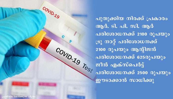 എറണാകുളം : ജില്ലയിലെ സ്വകാര്യ ലാബുകളിലും ആശുപത്രികളിലും കോവിഡ് പരിശോധന നടത്തുന്നതിനുള്ള നിരക്ക് പുനഃനിർണയിച്ചു കൊണ്ട് ജില്ലാ ദുരന്ത നിവാരണഅതോറിറ്റി ചെയർമാൻ കൂടിയായ ജില്ലാ കളക്ടർ ഉത്തരവിറക്കി. പുതുക്കിയ നിരക്ക് പ്രകാരം ആർ. ടി. പി. സി. ആർ പരിശോധനക്ക് 2100 രൂപയും ട്രൂ നാറ്റ് പരിശോധനക്ക് 2100 രൂപയും ആന്റിജൻ പരിശോധനക്ക് 625രൂപയും ജീൻ എക്സ്പെർട്ട് പരിശോധനക്ക് 2500 രൂപയും ഈടാക്കാൻ സാധിക്കു. സ്വാബ്ബിങ് ചാർജ്, പി. പി. ഇ കിറ്റ് ചാർജ് തുടങ്ങിയവ ഉൾപ്പടെയാണ് ഈ തുക.