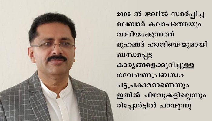 2006 ൽ ജലീൽ സമർപ്പിച്ച മലബാർ കലാപത്തെയും വാരിയംകുന്നത്ത് മുഹമ്മദ് ഹാജിയെയുമായി ബന്ധപ്പെട്ട കാര്യങ്ങളെക്കുറിച്ചുള്ള ഗവേഷണപ്രബന്ധം ചട്ടപ്രകാരമാണെന്നും ഇതിൽ പിഴവുകളില്ലെന്നും റിപ്പോർട്ടിൽ പറയുന്നു. ഇതോടെ പ്രബന്ധത്തിൽ പിഴവുകളുണ്ടെന്ന പരാതി തള്ളുകയും ചെയ്തു.