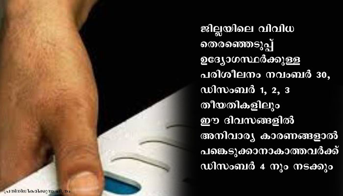വയനാട്: തദ്ദേശ സ്വയംഭരണ സ്ഥാപനങ്ങളിലേക്കുള്ള പൊതുതെരഞ്ഞെടുപ്പിനായി ജില്ലയിലെ വിവിധ തെരഞ്ഞെടുപ്പ് ഉദ്യോഗസ്ഥര്ക്കുള്ള പരിശീലനം നവംബര് 30, ഡിസംബര് 1, 2, 3 തീയതികളിലും ഈ ദിവസങ്ങളില് അനിവാര്യ കാരണങ്ങളാല് പങ്കെടുക്കാനാകാത്തവര്ക്ക് ഡിസംബര് 4 നും നടക്കും. നവംബര് 30 ന് സെന്റ് പാട്രിക് സ്കൂള് മാനന്തവാടി, ഡിസംബര് 1 ന് പനമരം ഗവ. എച്ച്.എസ്.എസ്., 2 ന് സുല്ത്താന് ബത്തേരി സര്വ്വജന എച്ച്.എസ്.എസ്., 3 നും 4 നും കല്പ്പറ്റ സെന്റ് ജോസഫ് സ്കൂള് എന്നിവിടങ്ങളിലാണ് പരിശീലനം. രാവിലെ 9.30 മുതല് ഒരു മണി വരെയും ഉച്ചയ്ക്ക് 1.30 മുതല് വൈകീട്ട് 5 വരെയുമുള്ള രണ്ട് ഷെഡ്യൂളുകളിലായാണ് പരിശീലനം. ജില്ലാ- ബ്ലോക്ക്തല ട്രൈനര്മാര് നേതൃത്വം നല്കും. പൂര്ണമായും കോവിഡ് പ്രോട്ടോക്കോള് പാലിച്ചാവും പരിശീലനം.