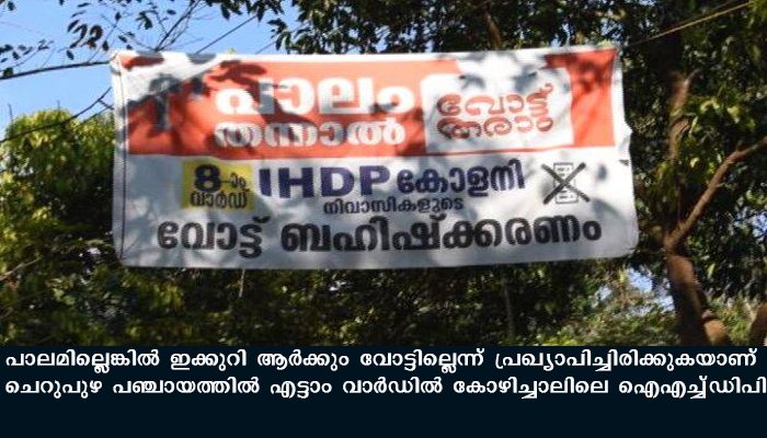 പാലമില്ലെങ്കില്‍ ഇക്കുറി ആര്‍ക്കും വോട്ടില്ലെന്ന് പ്രഖ്യാപിച്ചിരിക്കുകയാണ് ചെറുപുഴ പഞ്ചായത്തില്‍ എട്ടാം വാര്‍ഡില്‍ കോഴിച്ചാലിലെ ഐഎച്ച്ഡിപി. കോളനി നിവാസികള്‍. 75 ഓളം കുടുംബങ്ങള്‍ താമസിക്കുന്ന കോളനിയിലേക്കുളള വഴിയും പരിസരവും കോഴിച്ചാല്‍ ടൗണും മുഴുവന്‍ പോസ്റ്റര്‍ ഒട്ടിച്ചും ബാനറുകള്‍ കെട്ടിയും പ്രതിഷേധിച്ചിരിക്കുകയാണ് ഇവരെല്ലാം.