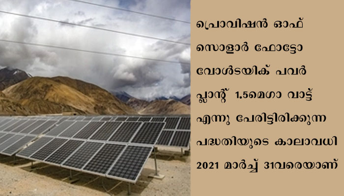 പ്രൊവിഷന്‍ ഓഫ് സൊളാര്‍ ഫോട്ടോ വോള്‍ടയിക് പവര്‍ പ്ലാന്റ് 1.5മെഗാ വാട്ട് എന്നു പേരിട്ടിരിക്കുന്ന പദ്ധതിയുടെ കാലാവധി 2021 മാര്‍ച്ച് 31വരെയാണ്. അന്തിമ കാലാവധിക്ക് മുന്‍പ് തന്നെ പദ്ധതി പൂര്‍ത്തിയായതായി പ്രതിരോധ വക്താവ് അറിയിച്ചു. കേന്ദ്ര ഊര്‍ജ മന്ത്രാലയത്തിന് കീഴിലുള്ള പദ്ധതി പ്രകാരം പ്രതിരോധ മേഖലയ്ക്ക് മൂന്ന് ഘട്ടങ്ങളിലായി 300 മെഗാവാട്ടും ലെ മേഖലയ്ക്കായി 14 മെഗാവാട്ടുമാണ് നിശ്ചയിച്ചിരിക്കുന്നത്. 122 കോടിയുടെ പദ്ധതി ഉദ്ഘാടനം നേരത്തെ വെസ്റ്റേണ്‍ എയര്‍ കമാന്‍ഡ് കമാന്‍ഡര്‍ ഇന്‍ ചീഫ് എയര്‍മാര്‍ഷല്‍ വിആര്‍ ചൗധരി നിര്‍വഹിച്ചിരുന്നു.