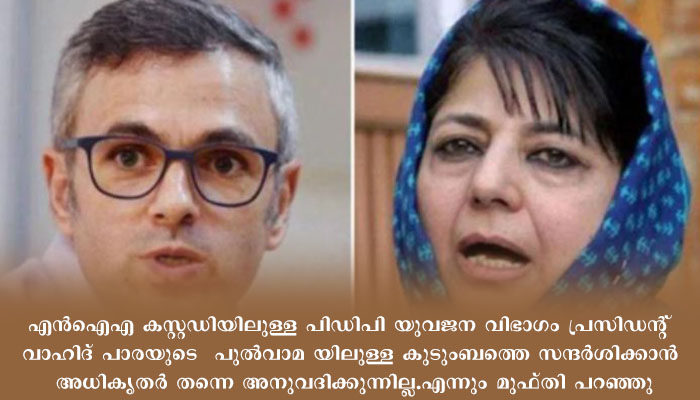 എന്ഐഎ കസ്റ്റഡിയിലുള്ള പിഡിപി യുവജന വിഭാഗം പ്രസിഡന്റ് വാഹിദ് പാരയുടെ പുൽവാമ യിലുള്ള കുടുംബത്തെ സന്ദര്ശിക്കാന് അധികൃതര് തന്നെ അനുവദിക്കുന്നില്ല.എന്നും മുഫ്തി പറഞ്ഞു.