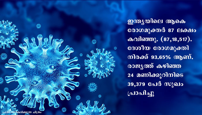 ഇന്ത്യയിലെ ആകെ രോഗമുക്തര് 87 ലക്ഷം കവിഞ്ഞു. (87,18,517). ദേശീയ രോഗമുക്തി നിരക്ക് 93.65% ആണ്. രാജ്യത്ത് കഴിഞ്ഞ 24 മണിക്കൂറിനിടെ 39,379 പേര് സുഖം പ്രാപിച്ചു.
