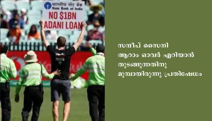 സിഡ്നി : ഇന്ത്യ – ഓസ്ട്രേലിയ ഏകദിന ക്രിക്കറ്റ് മത്സരത്തിനിടെ അദാനിക്കെതിരെ പ്രതിഷേധം. രണ്ടു പേര്‍ ഗ്യാലറിയില്‍നിന്ന് മൈതാനത്തിറങ്ങി കളി തടസ്സപ്പെടുത്തി പ്രതിഷേധിച്ചു. ഇവരിലൊരാള്‍ ‘നോ വണ്‍ ബില്യണ്‍ അദാനി ലോണ്‍’ എന്ന പ്ലക്ക് കാര്‍ഡ് ഉയര്‍ത്തി പിച്ചില്‍ കയറിനിന്നു. സന്ദീപ് സൈനി ആറാം ഓവര്‍ എറിയാന്‍ തുടങ്ങുന്നതിനു മുമ്പായിരുന്നു പ്രതിഷേധം.