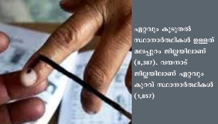 തിരുവനന്തപുരം ജില്ലയില് മത്സര രംഗത്തുള്ളത് 6465 സ്ഥാനാര്ത്ഥികളാണ്. ഇതില് 3343 പുരുഷന്മാരും 3122 സ്ത്രീകളുമാണുള്ളത്. കൊല്ലം 5723 (പു- 3040, സ്ത്രീ- 2683), പത്തനംതിട്ട 3699 (പു- 2014, സ്ത്രീ- 1685), ആലപ്പുഴ 5463 (പു- 2958, സ്ത്രീ- 2505), കോട്ടയം 5432 (പു- 2828, സ്ത്രീ- 2604), ഇടുക്കി 3234 (പു- 1646, സ്ത്രീ- 1588), എറണാകുളം 7255 (പു-3732, സ്ത്രീ- 3523), തൃശ്ശൂര് 7020 (പു- 3671, സ്ത്രീ- 3349), പാലക്കാട് 6587 (പു- 3321, സ്ത്രീ- 3266), മലപ്പുറം 8387 (പു- 3997, സ്ത്രീ- 4390), കോഴിക്കോട് 5985 (പു- 3078, സ്ത്രീ- 2907), വയനാട് 1857 (പു- 987, സ്ത്രീ- 870), കണ്ണൂര് 5144 (പു- 2630, സ്ത്രീ- 2513, ട്രാന്സ്ജെന്റര്- 1), കാസര്കോട് 2648 (പു- 1348, സ്ത്രീ- 1300) എന്നിങ്ങനെയാണ് വിവിധ ജില്ലകളില് ജനവിധി തേടുന്ന സ്ഥാനാര്ത്ഥികളുടെ ആകെ എണ്ണം.