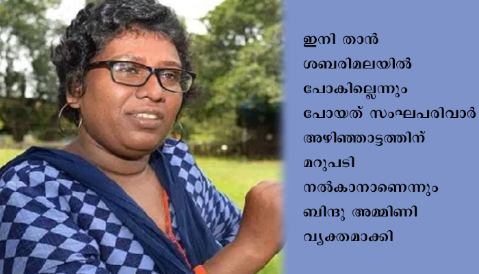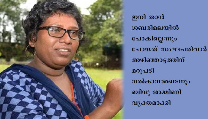 ഇനി താൻ ശബരിമലയിൽ പോകില്ലെന്നും പോയത് സംഘപരിവാര് അഴിഞ്ഞാട്ടത്തിന് മറുപടി നല്കാനാണെന്നും ബിന്ദു അമ്മിണി വ്യക്തമാക്കി. എന്നാൽ മല ചവുട്ടിയതിൽ പശ്ചാത്താപം ഇല്ലെന്നും ബിന്ദു അമ്മിണി പറഞ്ഞു.