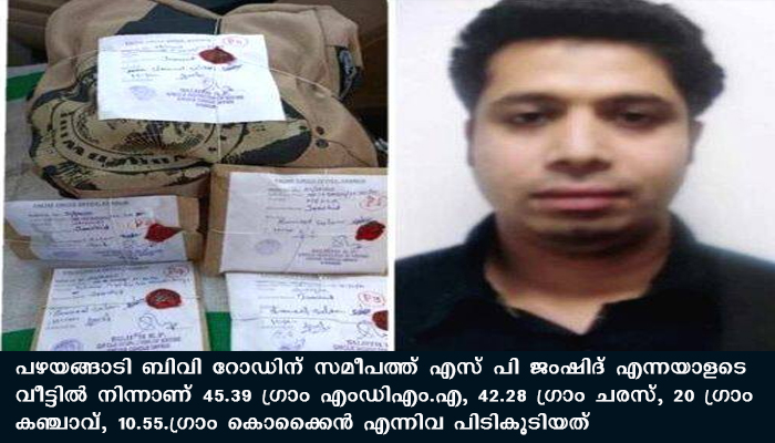 പഴയങ്ങാടി: വന് മയക്കുമരുന്ന് ശേഖരം പിടികൂടി. പഴയങ്ങാടി ബിവി റോഡിന് സമീപത്ത് എസ് പി ജംഷിദ് എന്നയാളടെ വീട്ടില് നിന്നാണ് 45.39 ഗ്രാം എംഡിഎം.എ, 42.28 ഗ്രാം ചരസ്, 20 ഗ്രാം കഞ്ചാവ്, 10.55.ഗ്രാം കൊക്കൈന് എന്നിവ പിടികൂടിയത്. തളിപ്പറമ്പ്,മടായി, മാട്ടൂല്,മുട്ടം എന്നിവിടങ്ങളില് മൊത്തമായി മയക്കുമരുന്നുവില്പ്പന നടത്തുന്നയാളാണ് പ്രതിയെന്ന് പോലീസ് പറഞ്ഞു.