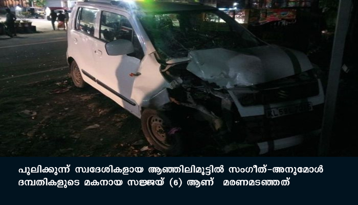 മുണ്ടക്കയം: കാറും ബൈക്കും കൂട്ടിയിടിച്ച് ആറുവയസുളള കുട്ടി മരണമടഞ്ഞു. .മുണ്ടക്കയം പുലിക്കുന്ന് സ്വദേശികളായ ആഞ്ഞിലിമൂട്ടില് സംഗീത്-അനുമോള് ദമ്പതികളുടെ മകനായ സജ്ജയ് (6) ആണ് മരണമടഞ്ഞത്. ഞായറാഴ്ച (29.11.2020) വൈകിട്ട് ഏഴുമണിയോടെ മുണ്ടക്കയം പൈങ്ങനക്കുസമീപമാണ് അപകടമുണ്ടായത്.