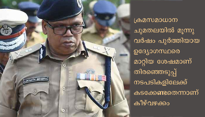 ക്രമസമാധാന ചുമതലയില് മൂന്നുവര്ഷം പുര്ത്തിയായ ഉദ്യോഗസ്ഥരെ മാറ്റിയ ശേഷമാണ് തിരഞ്ഞെടുപ്പ് നടപടികളിലേക്ക് കടക്കേണ്ടതെന്നാണ് കീഴ്വഴക്കം. നിലവില് ലോക്നാഥ് ബെഹ്റ ചുമതലയേറ്റിട്ട് മൂന്നുവര്ഷം പിന്നിട്ടു. അടുത്ത ജൂണ്വരെ കാലാവധിയുണ്ട്. ഈ സാഹചര്യത്തിലാണ് തിരഞ്ഞെടുപ്പിലെ ക്രമസമാധാന ചുമതലയുള്പ്പടെയുളളവ മറ്റൊരു മുതിര്ന്ന ഉദ്യോഗസ്ഥന് കൈമാറണമോയെന്ന കാര്യം തെരഞ്ഞെടുപ്പ് കമ്മീഷന് പരിഗണിക്കുന്നത്.