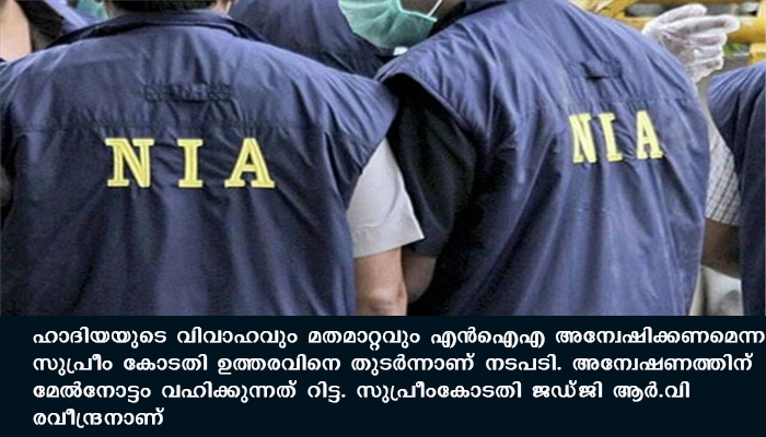 ഹാദിയയുടെ വിവാഹവും മതമാറ്റവും എന്ഐഎ അന്വേഷിക്കണമെന്ന സുപ്രീം കോടതി ഉത്തരവിനെ തുടർന്നാണ് നടപടി. അന്വേഷണത്തിന് മേൽനോട്ടം വഹിക്കുന്നത് റിട്ട. സുപ്രീംകോടതി ജഡ്ജി ആര്.വി രവീന്ദ്രനാണ്. കേസ് എൻഐഎ അന്വേഷിക്കുന്നത് കേരള സര്ക്കാര് കോടതിയില് എതിര്ത്തില്ല.ഹാദിയ കേസ് കേന്ദ്ര ഏജന്സി അന്വേഷിക്കണമെന്ന് കേന്ദ്രസര്ക്കാര് സുപ്രീം കോടതിയില് ആവശ്യപ്പെട്ടിരുന്നു.