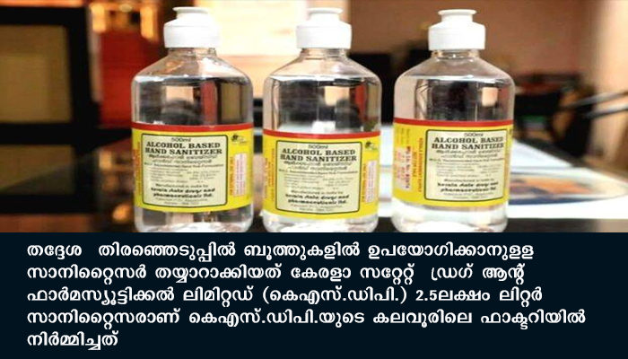 തിരുവനന്തപുരം: തദ്ദേശ തിരഞ്ഞെടുപ്പില്‍ ബൂത്തുകളില്‍ ഉപയോഗിക്കാനുളള സാനിറ്റൈസര്‍ തയ്യാറാക്കിയത് കേരളാ സറ്റേറ്റ് ഡ്രഗ് ആന്റ് ഫാര്‍മസ്യൂട്ടിക്കല്‍ ലിമിറ്റഡ്(കെഎസ്.ഡിപി.)2.5ലക്ഷം ലിറ്റര്‍ സാനിറ്റൈസരാണ് കെഎസ്.ഡിപി.യുടെ കലവൂരിലെ ഫാക്ടറിയില്‍ നിര്‍മ്മിച്ചത്. സംസ്ഥാനത്തെ 34,780 ബൂത്തുകളില്‍ ഇതുപയോഗിക്കും. മുഴുവന്‍ ജില്ലകളിലും സാനിറ്റൈസറുകള്‍ എത്തിച്ചു.