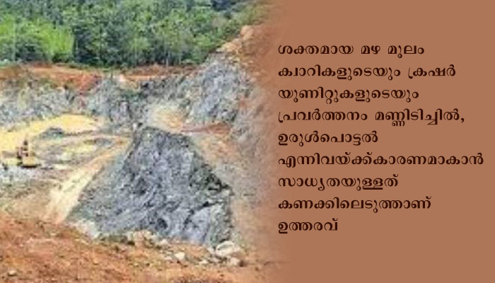 ശക്തമായ മഴ മൂലം ക്വാറികളുടെയും ക്രഷര് യൂണിറ്റുകളുടെയും പ്രവര്ത്തനം മണ്ണിടിച്ചില്, ഉരുള്പൊട്ടല് എന്നിവയ്ക്ക്കാരണമാകാന് സാധ്യതയുള്ളത് കണക്കിലെടുത്താണ് ഉത്തരവ്. മലയോരത്തു നിന്നും മണ്ണ് വെട്ടിമാറ്റുക, ആഴത്തിലുള്ള കുഴികള് നിര്മിക്കുക, നിര്മാണത്തിനായി ആഴത്തില് മണ്ണ് മാറ്റുക എന്നിവയും നിരോധിച്ചിട്ടുണ്ട്.