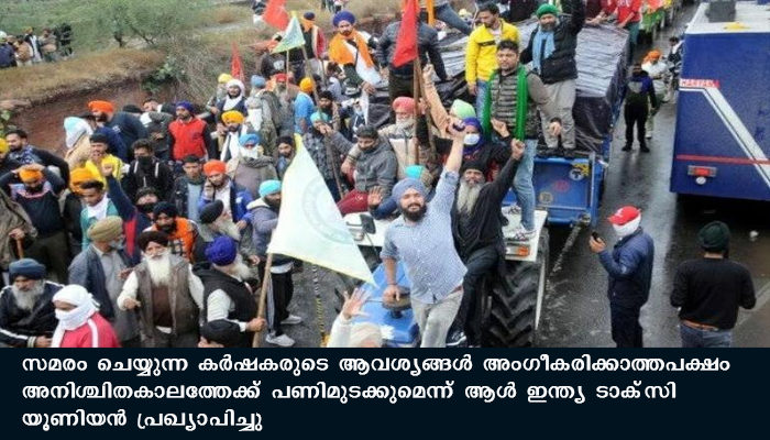 ന്യൂഡൽഹി: സമരം ചെയ്യുന്ന കര്ഷകരുടെ ആവശ്യങ്ങള് അംഗീകരിക്കാത്തപക്ഷം അനിശ്ചിതകാലത്തേക്ക് പണിമുടക്കുമെന്ന് ആള് ഇന്ത്യ ടാക്സി യൂണിയന് പ്രഖ്യാപിച്ചു. കോര്പ്പറേറ്റുകള് നാടിനെ നശിപ്പിച്ചുകൊണ്ടിരിക്കുകയാണെന്ന് യൂണിയൻ ദേശീയ നേതാക്കൾ ചൊവ്വാഴ്ച(01/12/2020) കുറ്റപ്പെടുത്തി.