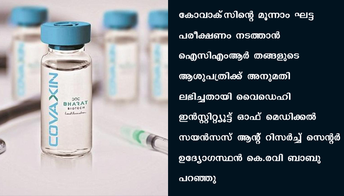ബെംഗളൂരു: ബെംഗളൂരുവിലെ വൈദേഹി മള്ട്ടി സ്പെഷ്യാലിറ്റി ആശുപത്രിയില് ബുധനാഴ്ച(02/12/2020) മുതല് ഭാരത് ബയോടെക് വികസിപ്പിച്ചുകൊണ്ടിരിക്കുന്ന കൊവാക്സിന്റെ മൂന്നാം ഘട്ട ക്ലിനിക്കല് പരീക്ഷണം ആരംഭിക്കും. കോവാക്സിന്റെ മൂന്നാം ഘട്ട പരീക്ഷണം നടത്താന് ഐസിഎംആര് തങ്ങളുടെ ആശുപത്രിക്ക് അനുമതി ലഭിച്ചതായി വൈഡെഹി ഇന്സ്റ്റിറ്റ്യൂട്ട് ഓഫ് മെഡിക്കല് സയന്സസ് ആന്റ് റിസര്ച്ച് സെന്റര് ഉദ്യോഗസ്ഥന് കെ.രവി ബാബു പറഞ്ഞു.പരീക്ഷണ വേളയില് വാക്സിന് സന്നദ്ധപ്രവര്ത്തകര്ക്ക് രണ്ട് ഡോസുകളായി നല്കും. ആദ്യത്തേത് ബുധനാഴ്ചയും രണ്ടാമത്തേത് ഡിസംബര് 30നും നല്കും. സന്നദ്ധപ്രവര്ത്തകര് ആശുപത്രിയില് തുടരേണ്ടതില്ലെങ്കിലും വിവരങ്ങള് അറിയാനായി വീഡിയോ കോള് വഴി ദിവസേന അവരെ നിരീക്ഷിക്കുമെന്നും കെ. രവി ബാബു പറഞ്ഞു.