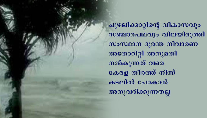 ഇനിയൊരു അറിയിപ്പുണ്ടാകുന്നത് വരെ കേരള തീരത്ത് നിന്ന് കടലില് പോകുന്നത് പൂര്ണ്ണമായും നിരോധിച്ചിട്ടുണ്ട്. വിലക്ക് എല്ലാത്തരം മല്സ്യബന്ധന യാനങ്ങള്ക്കും ബാധകമായിരിക്കും. നിലവില് മല്സ്യബന്ധനത്തിലേര്പ്പെട്ടിരിക്കുന്നവര് എത്രയും പെട്ടെന്ന് തന്നെ ഏറ്റവും അടുത്തുള്ള സുരക്ഷിത തീരത്ത് എത്തിച്ചേരേണ്ടതാണ്. ചുഴലിക്കാറ്റിന്റെ വികാസവും സഞ്ചാരപഥവും വിലയിരുത്തി സംസ്ഥാന ദുരന്ത നിവാരണ അതോറിറ്റി അനുമതി നല്കുന്നത് വരെ കേരള തീരത്ത് നിന്ന് കടലില് പോകാന് അനുവദിക്കുന്നതല്ല.