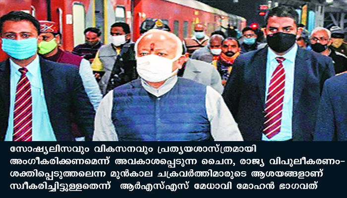 ന്യൂഡല്‍ഹി: സോഷ്യലിസവും വികസനവും പ്രത്യയശാസ്ത്രമായി അംഗീകരിക്കണമെന്ന് അവകാശപ്പെടുന്ന ചൈന, രാജ്യ വിപുലീകരണം-ശക്തിപ്പെടുത്തലെന്ന മുന്‍കാല ചക്രവര്‍ത്തിമാരുടെ ആശയങ്ങളാണ് സ്വീകരിച്ചിട്ടുള്ളതെന്ന് ആര്‍എസ്എസ് മേധാവി മോഹന്‍ ഭാഗവത് അഭിപ്രായപ്പെട്ടു.യുഎസിന്റെ ശ്രമങ്ങള്‍ കൊണ്ട് ലോകരാജ്യങ്ങള്‍ക്കിടയില്‍ ധ്രുവീകരണമുണ്ടായി. എന്നാല്‍ ചൈനയെ ഇതൊന്നും ബാധിക്കുന്നില്ല. ലോകം തങ്ങളെ കുറിച്ച് എന്ത് ചിന്തിക്കുന്നുവെന്ന് അറിയാന്‍ അവര്‍ക്ക് സമയമില്ല, പകരം ലോക ശക്തിയാവുകയെന്ന ലക്ഷ്യത്തിലേക്ക് അത് നീങ്ങുകയാണെന്നും അദ്ദേഹം കൂട്ടിച്ചേര്‍ത്തു.