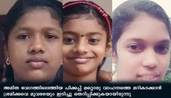 പുനലൂര്: വിദ്യാര്ത്ഥികള്ക്കുനേരെ പിക്ക്-അപ് വാന് പാഞ്ഞുകയറി മൂന്നുപേര് മരിച്ചു. ഉറുകുന്ന് ഓലിക്കല് അലക്സിന്റെയും സിന്ധുവിന്റെയും മക്കളായ ശാലിനി (14), സഹോദരി ശ്രൂതി(13), അയല്വാസി ടിസന്ഭവനില് കുഞ്ഞുമോന്റെയും സുജയുടെയും മകള് കെസിയ(17) എന്നിവരാണ് മരിച്ചത്. ബുധനാഴ്ച (02/12/2020)ഉച്ചക്ക് മൂന്നരയോടെ ദേശീയപാതയില് ഉറുകുന്ന് മുസിലിയാര് പാടത്തിന് സമീപമായിരുന്നു നാടിനെ ഞെട്ടിച്ച അപകടം.