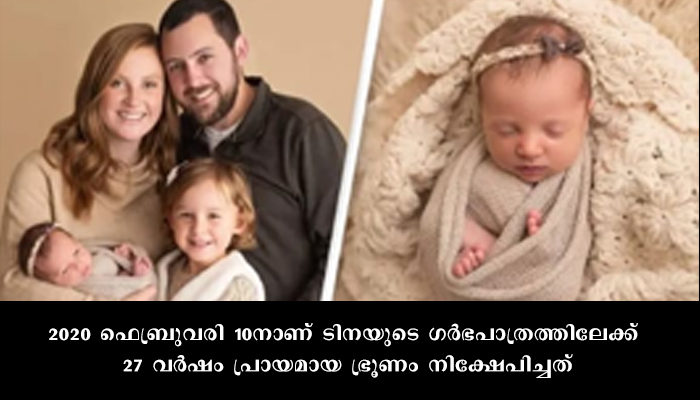 ഒരു മാസം പോലും പ്രായമായിട്ടില്ല എന്നതാണ് കൗതുകം. 2020 ഒക്ടോബര് 26നാണ് 27 വര്ഷമായി ശീതികരിച്ച് സൂക്ഷിച്ചിരുന്ന ഭ്രൂണത്തിൽ നിന്നും മോളി ജനിച്ചത്. 2020 ഫെബ്രുവരി 10നാണ് ടിനയുടെ ഗര്ഭപാത്രത്തിലേക്ക് 27 വർഷം പ്രായമായ ഭ്രൂണം നിക്ഷേപിച്ചത്. യൂണിവേഴ്സിറ്റി ഒഫ് ടെന്നസീ പ്രിസ്റ്റണ് മെഡിക്കല് ലൈബ്രറി അധികൃതര് പറയുന്നത്. ചരിത്രത്തിലാദ്യമായാണ് ഇത്രയും കാലം സൂക്ഷിച്ച ഭ്രൂണത്തില് നിന്നും ഒരു കുഞ്ഞ് പിറക്കുന്നത് എന്നാണ്. എന്നാൽ ഇതിന് മുമ്പ് ഈ റെക്കോര്ഡ് കരസ്ഥമാക്കിയത് മോളിയുടെ മൂത്ത സഹോദരിയായ എമ്മ വ്രെന് ഗിബ്സണ് ആണ്. മോളിയുടെ മാതാപിതാക്കളായ ടിന – ബെന് ഗിബ്സണ് ദമ്പതികളുടെ ആദ്യത്തെ കുഞ്ഞായ എമ്മയുടെ ജനനവും ശീതീകരിച്ച് സൂക്ഷിച്ചിരുന്ന ഭ്രൂണത്തില് നിന്നാണ്.