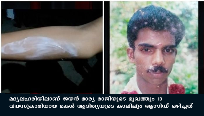 മദ്യലഹരിയിലാണ് ജയന് ഭാര്യ രാജിയുടെ മുഖത്തും 13 വയസുകാരിയായ മകള് ആദിത്യയുടെ കാലിലും ആസിഡ് ഒഴിച്ചത്. നിലവിളിച്ചുകൊണ്ട് വീട്ടില് നിന്നും ഇറങ്ങി ഓടിയ ഭാര്യയുടേയും മകളുടേയും പിന്നാലെ ഓടിയ ജയന് അയല് വീട്ടിലെ ബന്ധുക്കളായ പ്രവീണ, നിരഞ്ജന, എന്നീ കുട്ടികളുടെ കൈയിലും ആസിഡ് ഒഴിച്ചു .ജയന്റെ ഭാര്യ രാജിക്ക് 40 ശതമാനം പൊളളലേറ്റിട്ടുണ്ട്. കുട്ടിയുടെപരിക്ക് ഗുരുതരമല്ല. ഒളിവില് പോയ ജയനായി ഇരവിപുരം പോലീസ് അന്വേഷണം തുടരുകയാണ്.