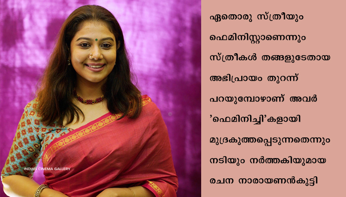 ഏതൊരു സ്ത്രീയും ഫെമിനിസ്റ്റാണെന്നും സ്ത്രീകൾ തങ്ങളുടേതായ അഭിപ്രായം തുറന്ന് പറയുമ്പോഴാണ് അവർ ‘ഫെമിനിച്ചി’കളായി മുദ്രകുത്തപ്പെടുന്നതെന്നും നടിയും നർത്തകിയുമായ രചന നാരായണൻകുട്ടി.ഫെമിനിസ്റ്റ് എന്ന വാക്കിന്റെ അർത്ഥം മനസിലാക്കാത്തവരാണ് ആ വാക്കിനെ ദുർവ്യാഖ്യാനം ചെയ്യുന്നതെന്നും ‘കേരളകൗമുദി ഫ്ളാഷ് മൂവീസി’ന് നൽകിയ അഭിമുഖത്തിൽ താരം പറഞ്ഞു: