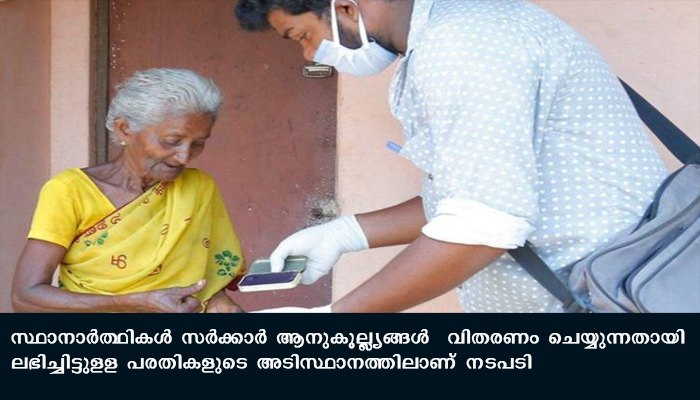 തിരുവനന്തപുരം: തദ്ദേശ തിരഞ്ഞെടുപ്പ് കഴിയുന്നതു വരെ സ്ഥാനാര്ത്ഥികള് ജോലിയുടെ ഭാഗമായോ അല്ലാതെയോ ആനുകൂല്ല്യങ്ങള് വിതരണം ചെയ്യാന് പാടില്ലെന്ന് സംസ്ഥാന തിരഞ്ഞെടുപ്പ് കമ്മീഷണര് വി ഭാസ്ക്കരന് നിര്ദ്ദേശിച്ചു. സ്ഥാനാര്ത്ഥികള് സര്ക്കാര് ആനുകൂല്ല്യങ്ങള് വിതരണം ചെയ്യുന്നതായി ലഭിച്ചിട്ടുളള പരതികളുടെ അടിസ്ഥാനത്തിലാണ് നടപടി.