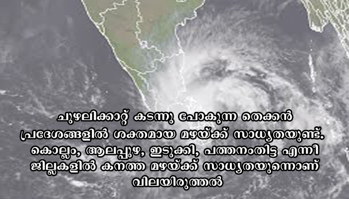 ചുഴലിക്കാറ്റ് കടന്നു പോകുന്ന തെക്കന് പ്രദേശങ്ങളില് ശക്തമായ മഴയ്ക്ക് സാധ്യതയുണ്ട്. കൊല്ലം, ആലപ്പുഴ, ഇടുക്കി, പത്തനംതിട്ട എന്നീ ജില്ലകളില് കനത്ത മഴയ്ക്ക് സാധ്യതയുണ്ടെന്നാണ് വിലയിരുത്തല്.