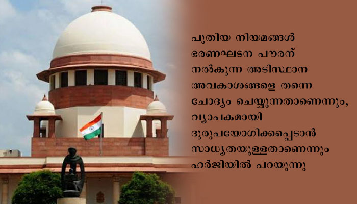 പുതിയ നിയമങ്ങൾ ഭരണഘടന പൗരന് നൽകുന്ന അടിസ്ഥാന അവകാശങ്ങളെ തന്നെ ചോദ്യം ചെയ്യുന്നതാണെന്നും , വ്യാപകമായി ദുരുപയോഗിക്കപ്പെടാൻ സാധ്യതയുള്ളതാണെന്നും ഹർജിയിൽ പറയുന്നു.