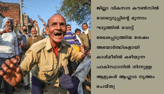 ശ്രീനഗർ: ജില്ലാ വികസന കൗൺസിൽ വോട്ടെടുപ്പിന്റെ മൂന്നാം ഘട്ടത്തിൽ വോട്ട് രേഖപ്പെടുത്തിയ ശേഷം അഭയാർത്ഥികളായി കാശ്മീരിൽ കഴിയുന്ന പാകിസ്ഥാനിൽ നിന്നുള്ള ആളുകൾ ആഹ്ലാദ നൃത്തം ചെയ്തു.