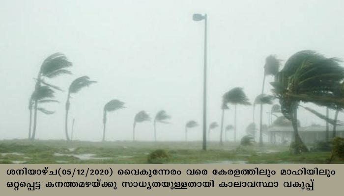ശനിയാഴ്ച(05/12/2020) വൈകുന്നേരം വരെ കേരളത്തിലും മാഹിയിലും ഒറ്റപ്പെട്ട കനത്തമഴയ്ക്കു സാധ്യതയുള്ളതായി കാലാവസ്ഥാ വകുപ്പ് അറിയിച്ചിട്ടുണ്ട്.