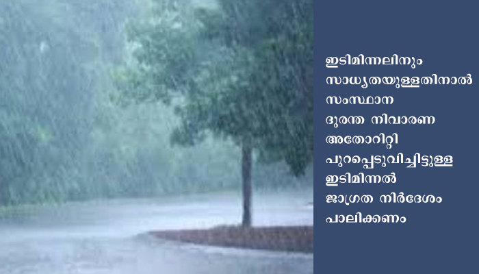 ഇടിമിന്നലിനും സാധ്യതയുള്ളതിനാല് സംസ്ഥാന ദുരന്ത നിവാരണ അതോറിറ്റി പുറപ്പെടുവിച്ചിട്ടുള്ള ഇടിമിന്നല് ജാഗ്രത നിര്ദേശം പാലിക്കണം. കേന്ദ്ര കാലാവസ്ഥ വകുപ്പ് മുന്നറിയിപ്പില് മാറ്റങ്ങള് വരുത്തുന്നതനുസരിച്ച് അലെര്ട്ടുകളില് മാറ്റം വരാം. കടല് പ്രക്ഷുബ്ധമാകാന് സാധ്യത, കടലില് പോകരുത്. ഡിസംബര് 6 വരെ കടല് അതിപ്രക്ഷുബ്ധമാകാന് സാധ്യതയുള്ളതിനാല് കേരള തീരത്ത് നിന്ന് കടലില് പോകുന്നത് പൂര്ണ്ണമായും നിരോധിച്ചു.