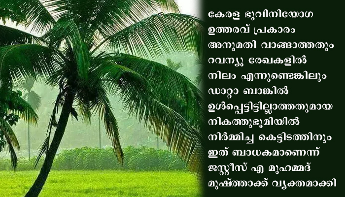 കേരള ഭൂവിനിയോഗ ഉത്തരവ് പ്രകാരം അനുമതി വാങ്ങാത്തതും റവന്യൂ രേഖകളില് നിലം എന്നുണ്ടെങ്കിലും ഡാറ്റാ ബാങ്കില് ഉള്പ്പെട്ടിട്ടില്ലാത്തതുമായ നികത്തുഭൂമിയില് നിര്മ്മിച്ച കെട്ടിടത്തിനും ഇത് ബാധകമാണെന്ന് ജസ്റ്റീസ് എ മുഹമ്മദ് മുഷ്ത്താക്ക് വ്യക്തമാക്കി. നിര്മ്മാണാനുമതി തേടി നല്കിയ അപേക്ഷയില് കൊച്ചിന് കോര്പ്പറേഷന് തീരുമാനമെടുക്കാത്തത് ചോദ്യം ചെയ്ത് കടവന്ത്രയിലെ ഗ്ലോബല് എഡ്യൂക്കേഷന് ട്രസ്റ്റ് നല്കിയ ഹര്ജി തീര്പ്പാക്കിയാണ് ഉത്തരവ്.
