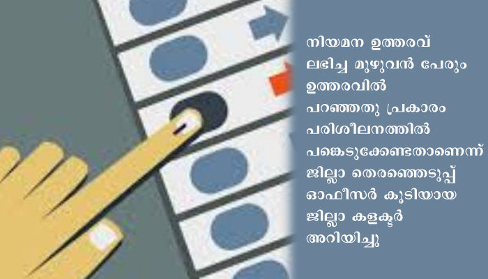 ജില്ലയില് നവംബര് 30 മുതല് ഡിസംബര് മൂന്നു വരെ നടന്ന പരിശീലന ക്ലാസ്സുകളില് പങ്കെടുക്കാന് സാധിക്കാതിരുന്ന ഉദ്യോഗസ്ഥരും ഡിസംബര് 7 ന് നടക്കുന്ന ക്ലാസ്സില് പങ്കെടുക്കണം. വീഴ്ച വരുത്തുന്ന ഉദ്യോഗസ്ഥര്ക്കെതിരേ നിയമ നടപടികള് സ്വീകരിക്കുന്നതാണെന്നും ജില്ലാ കളക്ടര് അറിയിച്ചു.