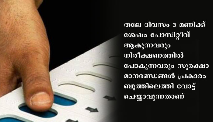 വോട്ടെടുപ്പിന് 10 ദിവസം മുമ്പ് മുതല് തലേ ദിവസം 3 മണി വരെ കോവിഡ് 19 പോസിറ്റീവ് ആയവരും ക്വാറന്റൈനില് ഉള്ളവരും പോളിംഗ് ബൂത്തില് പോകേണ്ടതില്ല. ഇവര്ക്ക് പ്രത്യേക തപാല് വോട്ട് ചെയ്യാം. തലേ ദിവസം 3 മണിക്ക് ശേഷം പോസിറ്റീവ് ആകുന്നവരും നിരീക്ഷണത്തില് പോകുന്നവരും സുരക്ഷാ മാനദണ്ഡങ്ങള് പ്രകാരം ബൂത്തിലെത്തി വോട്ട് ചെയ്യാവുന്നതാണ്. എന്തെങ്കിലും സംശയമുണ്ടെങ്കില് ദിശ 1056ല് വിളിക്കാവുന്നതാണ്
