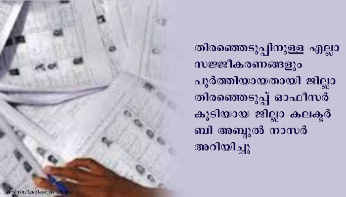 സ്ഥാനാര്‍ഥികളില്‍ 3028 സ്ത്രീകളും 2689 പുരുഷന്‍മാരുമാണ്. ആകെ വോട്ടര്‍മാരില്‍ 11.7 ലക്ഷം സ്ത്രീകളും 10.42 ലക്ഷം പുരുഷന്മാരും 19 ട്രാന്‍സ്ജെന്‍ഡേഴ്സും ഉള്‍പ്പെടുന്നു. 2761 പോളിംഗ് സ്റ്റേഷനുകളിലാണ് വോട്ടെടുപ്പ് നടക്കുക. വോട്ടെടുപ്പിനായി ജില്ലയില്‍ ആകെ 3236 കണ്‍ട്രോള്‍ യൂണിറ്റുകളും 8660 ബാലറ്റ് യൂണിറ്റുകളും സജ്ജമാണ്. കരുതലായി വച്ചിട്ടുള്ള യന്ത്രങ്ങള്‍ ഉള്‍പ്പടെയുള്ള കണക്കാണിത്. പോളിംഗ് ബൂത്തുകളില്‍ ഉപയോഗിക്കാന്‍ കണ്‍ട്രോള്‍ യൂണിറ്റുകള്‍ 276 എണ്ണവും ബാലറ്റ് യൂണിറ്റ് 748 എണ്ണവും മതിയാതും. കരുതലായി 128 കണ്‍ട്രോള്‍ യൂണിറ്റ് 222 ബാലറ്റ് യൂണിറ്റ് മാറ്റിവെച്ചിട്ടുണ്ട്. എത്തിപ്പെടാന്‍ ബുദ്ധിമുട്ടുള്ള ദുര്‍ഘട മേഖലകളില്‍ 15 കണ്‍ട്രോള്‍ യൂണിറ്റും 45 ബാലറ്റ് യൂണിറ്റുകളും മുന്‍കൂറായി നല്‍കിയിട്ടുണ്ട്. യന്ത്രങ്ങള്‍ അഥവാ കേടുവന്നാല്‍ സെക്ട്രല്‍ ഓഫീസര്‍മാര്‍ പുതിയ യന്ത്രങ്ങള്‍ ബൂത്തുകളിലെത്തിക്കും, ഇതിനായി 332 കണ്‍ട്രോള്‍ യൂണിറ്റും 908 ബാലറ്റ് യൂണിറ്റുകളും സെക്ട്രല്‍ ഓഫീസര്‍മാര്‍ക്ക് നല്‍കിയിട്ടുണ്ട്. 13805 ഉദ്യോഗസ്ഥരാണ് പോളിംഗ് ബൂത്തുകളില്‍ വോട്ട് ചെയ്യിക്കാനായി തയ്യാറാകുന്നത്. ഇന്ന്(ഡിസംബര്‍ 7) വിതരണ കേന്ദ്രങ്ങളില്‍ നിന്നും വോട്ടിങിനുള്ള സാമഗ്രികള്‍ കൈപ്പറ്റിയ ശേഷം അവര്‍ പോളിംഗ് ബൂത്തുകളില്‍ എത്തി വോട്ടെടുപ്പിനു തയ്യാറാകും. ഒരു മുഖ്യ നിരീക്ഷകനും  അഞ്ച് ചെലവ് നിരീക്ഷകരുമാണ് ജില്ലയില്‍ നിരീക്ഷണം നടത്തുക.