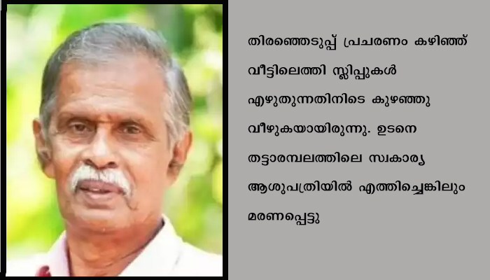 ചെട്ടികുളങ്ങര: ചെട്ടികുളങ്ങര ഗ്രാമപഞ്ചായത്ത് ഏഴാം വാർഡിലെ എൽഡിഎഫ് സ്ഥാനാർത്ഥി കുഴഞ്ഞു വീണു മരിച്ചു. ഈരേഴ തെക്ക് ചെമ്പോലിൽ കെ. മഹാദേവൻ പിള്ളയാണ് മരിച്ചത്. 6 – 12 – 2020 ഞായറാഴ്ച രാത്രി 8.25 നായിരുന്നു സംഭവം.
