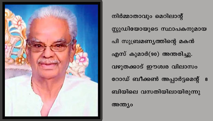 തിരുവനന്തപുരം: നിര്മ്മാതാവും മെറിലാന്റ് സ്റ്റുഡിയോയുടെ സ്ഥാപകനുമായ പി സുബ്രമണ്യത്തിന്റെ മകന് എസ് കുമാര്(90) അന്തരിച്ചു. വഴുതക്കാട് ഈശ്വര വിലാസം റോഡ് ബീക്കണ് അപ്പാര്ട്ടമെന്റ് 8 ബിയിലെ വസതിയിലായിരുന്നു അന്ത്യം. എണ്പതുകളില് മലയാള സിനിമയില് സജീവമായിരുന്ന ശാസ്താ പ്രൊഡക്ഷന്സ് എന്ന നിര്മ്മാണ കമ്പനിയുടെ ഉടമസ്ഥനായിരുന്നു.