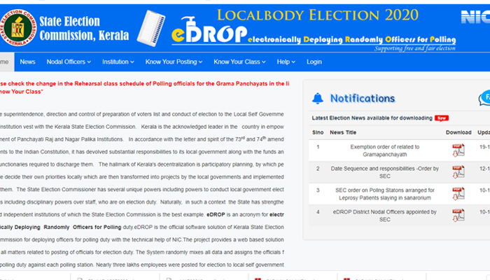 തൃശ്ശൂർ: പൊതുതിരഞ്ഞെടുപ്പിൽ പോളിങ് ഡ്യൂട്ടിക്കാവശ്യമായ പ്രിസൈഡിംഗ് ഓഫീസമാർ, ഫസ്റ്റ് പോളിങ് ഓഫീസർമാർ തുടങ്ങിയവരെ കുറ്റമറ്റ രീതിയിൽ വിന്യസിപ്പിക്കാൻ ഇ ഡ്രോപ്പ് വെബ് പോർട്ടൽ സുപ്രധാന പങ്ക് വഹിക്കുന്നു. തിരഞ്ഞെടുപ്പുകളിൽ ഉദ്യോഗസ്ഥരെ നിയമിക്കുന്നതുമായി ബന്ധപ്പെട്ട എല്ലാ പ്രശ്നങ്ങൾക്കും പരിഹാരമായാണ് നാഷണൽ ഇൻഫർമാറ്റിക്സ് സെന്റർ കേരള വെബ് അടിസ്ഥാനത്തിൽ ഇ ഡ്രോപ്പ് പോർട്ടലിന് തുടക്കം കുറിച്ചത്. (www.edrop. gov.in) ഇതോടെ വളരെ പ്രയാസമേറിയതും സമയ ബന്ധിതമായി തീർക്കേണ്ടതും പ്രയത്നം ഏറെ ആവശ്യമുള്ളതുമായ പ്രവർത്തനങ്ങൾക്കാണ് ശാശ്വത പരിഹാരമായിരിക്കുന്നത്. സംസ്ഥാന തിരഞ്ഞെടുപ്പ് കമ്മീഷൻ നിർദേശിക്കുന്ന വികേന്ദ്രീകരണ സംവിധാനത്തിലൂടെ ഈ പോർട്ടൽ വഴി സ്ഥാപന മേധാവികൾക്ക് ലോഗിൻ ഐഡി യും പാസ്സ് വേർഡും നൽകുന്നു.