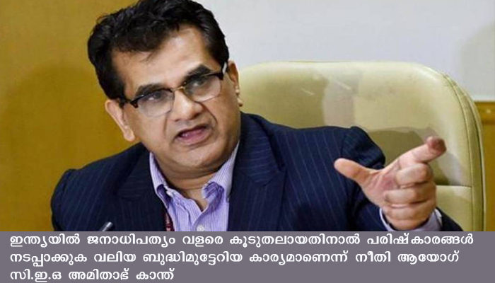 ന്യൂഡൽഹി: ഇന്ത്യയില് ജനാധിപത്യം വളരെ കൂടുതലായതിനാല് പരിഷ്കാരങ്ങള് നടപ്പാക്കുക വലിയ ബുദ്ധിമുട്ടേറിയ കാര്യമാണെന്ന് നീതി ആയോഗ് സി.ഇ.ഒ അമിതാഭ് കാന്ത്. ഇന്ത്യയെ മത്സര സ്വഭാവമുള്ള ഒരു രാജ്യമാക്കി മാറ്റാന് ഇനിയും ഒരുപാട് നവീകരണങ്ങള് ഇന്ത്യയില് നടപ്പാക്കേണ്ടതുണ്ടെന്നും അദ്ദേഹം പറഞ്ഞു.