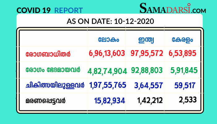 10-12-2020, വ്യാഴാഴ്ച 4470 പേർക്ക് കോവിഡ്, 4847 പേർ രോഗമുക്തർ, ചികിത്സയിലുള്ളവർ 59,517; രണ്ട് പുതിയ ഹോട്ട് സ്‌പോട്ടുകൾ