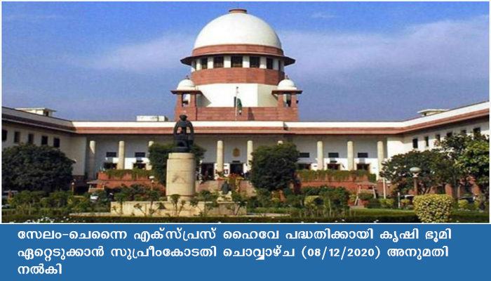 ചെന്നൈ: സേലം-ചെന്നൈ എക്സ്​പ്രസ്​ ഹൈവേ പദ്ധതിക്കായി കൃഷി ഭൂമി ഏറ്റെടുക്കാൻ സുപ്രീംകോടതി ചൊവ്വാഴ്ച(08/12/2020) അനുമതി നൽകി. നേരത്തെ കർഷകരുടെ പ്രതിഷേധത്തെ തുടർന്ന്​ പദ്ധതി താൽക്കാലികമായി നിർത്തിവച്ചിരുന്നു.