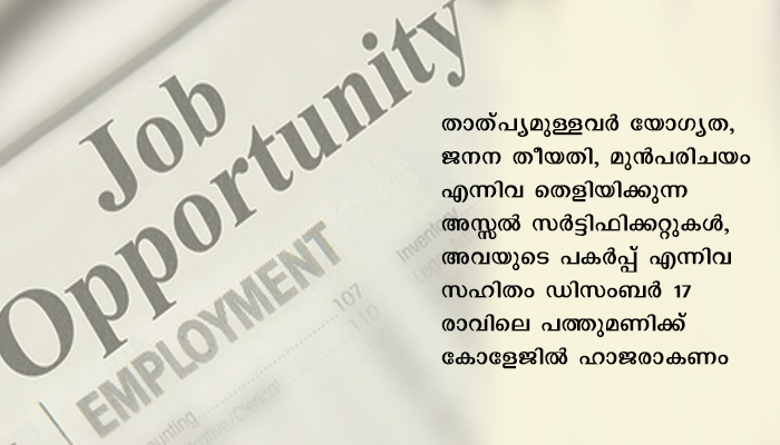 മലയിന്കീഴ് എം.എം.എസ് ഗവ. ആര്ട്സ് ആന്റ് സയന്സ് കോളേജില് മലയാളം, ഹിന്ദി, ജേര്ണലിസം, സ്റ്റാറ്റിസ്റ്റിക്സ്, ഫിസിക്സ് വിഷയങ്ങളില് ഗസ്റ്റ് ലക്ചറര്മാരെ നിയമിക്കുന്നതിന് വാക്ക് ഇന് ഇന്റര്വ്യു നടത്തുന്നു. കോളേജ് വിദ്യാഭ്യാസ വകുപ്പ് ഡെപ്യൂട്ടി ഡയറക്ടര്, കൊല്ലം മേഖലാ ഓഫീസില് ഗസ്റ്റ് ലക്ചറര്മാരുടെ പാനലില് പേരു രജിസ്റ്റര് ചെയ്തിട്ടുള്ളവര്ക്ക് ഇന്റര്വ്യുവില് പങ്കെടുക്കാം. താത്പ്യമുള്ളവര് യോഗ്യത, ജനന തീയതി, മുന്പരിചയം എന്നിവ തെളിയിക്കുന്ന അസ്സല് സര്ട്ടിഫിക്കറ്റുകള്, അവയുടെ പകര്പ്പ് എന്നിവ സഹിതം ഡിസംബര് 17 രാവിലെ പത്തുമണിക്ക് കോളേജില് ഹാജരാകണം. കൂടുതല് വിവരങ്ങള്ക്ക് 0471-2282020.