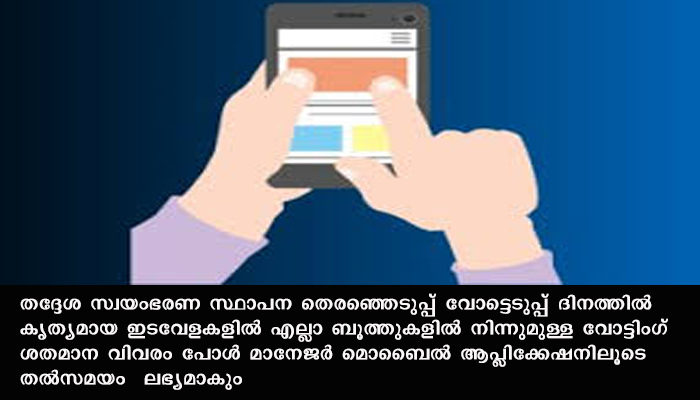 കാസർഗോഡ്: തദ്ദേശ സ്വയംഭരണ സ്ഥാപന തെരഞ്ഞെടുപ്പ് വോട്ടെടുപ്പ് ദിനത്തില്‍ കൃത്യമായ ഇടവേളകളില്‍ എല്ലാ ബൂത്തുകളില്‍ നിന്നുമുള്ള വോട്ടിംഗ് ശതമാന വിവരം പോള്‍ മാനേജര്‍ മൊബൈല്‍ ആപ്ലിക്കേഷനിലൂടെ തല്‍സമയം  ലഭ്യമാകും. വോട്ടെടുപ്പുമായി ബന്ധപ്പെട്ട പ്രധാന വിവരങ്ങള്‍ വേഗത്തില്‍ ജില്ലാ തലത്തില്‍ ലഭ്യമാക്കാനാണ് ഈ സംവിധാനം. നാഷനല്‍ ഇന്‍ഫര്‍മാറ്റിക്‌സ് സെന്ററാണ് ആപ്പ് വികസിപ്പിച്ചത്.