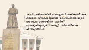 2020-21 വര്ഷത്തില് സ്കൂളുകള് അമിതഫീസോ, ലാഭമോ ഈടാക്കരുതെന്ന ഹൈക്കോടതിയുടെ ഇടക്കാല ഉത്തരവിനെ തുടര്ന്ന് പൊതുവിദ്യാഭ്യാസ വകുപ്പ് മാര്ഗനിര്ദേശം പുറപ്പെടുവിച്ചു. കോവിഡ് 19 എല്ലാവരെയും സാമ്പത്തികമായി ബാധിച്ച സാഹചര്യത്തില് 2020-21 അധ്യായന വര്ഷത്തില് സ്കൂള് നടത്തിപ്പിന് ആവശ്യമായതില് അധികം തുക ഈടാക്കരുത്. നേരിട്ടോ അല്ലാതെയോ ലാഭം ഉണ്ടാക്കാനുള്ള നടപടികളും സ്വീകരിക്കരുത്. കോവിഡ് സാഹചര്യത്തില് ലഭ്യമാക്കിയ സൗകര്യങ്ങള്ക്ക് അനുസൃതമായി മാത്രമേ ഫീസ് ഈടാക്കാവൂ. കോവിഡ് പശ്ചാത്തലത്തിലുളള ഈ നിര്ദ്ദേശം 2020-21 കാലഘട്ടത്തിലേക്ക് മാത്രമുളളതാണെന്നും തുടര് വര്ഷങ്ങളില് ബാധകമല്ലെന്നും മാര്ഗ്ഗ നിര്ദ്ദേശത്തില് വ്യക്തമാക്കിയിട്ടുണ്ട്. സ്വകാര്യ സ്കൂളുകളില് അമിത ഫീസ് ഈടാക്കുന്നുവെന്നത് സംബന്ധിച്ച് വിദ്യാര്ഥികള് സമര്പ്പിച്ച പരാതിയിലായിരുന്നു ഹൈക്കോടതി ഇടക്കാല വിധി പുറപ്പെടുവിച്ചത്.