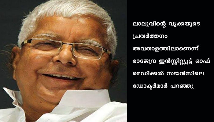 ലാലുവിന്റെ വൃക്കയുടെ പ്രവര്ത്തനം അവതാളത്തിലാണെന്ന് രാജേന്ദ്ര ഇന്സ്റ്റിറ്റ്യൂട്ട് ഓഫ് മെഡിക്കല് സയന്സിലെ ഡോക്ടര്മാര് പറഞ്ഞു.