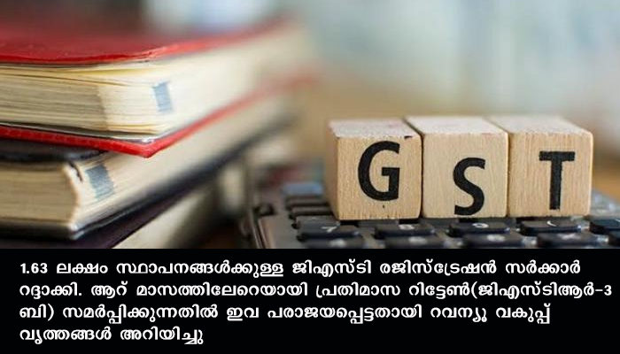 ന്യൂഡൽഹി: 1.63 ലക്ഷം സ്ഥാപനങ്ങൾക്കുള്ള ജിഎസ്ടി രജിസ്ട്രേഷൻ സർക്കാർ റദ്ദാക്കി. ആറ് മാസത്തിലേറെയായി പ്രതിമാസ റിട്ടേൺ (ജിഎസ്ടിആർ -3 ബി) സമർപ്പിക്കുന്നതിൽ ഇവ പരാജയപ്പെട്ടതായി റവന്യൂ വകുപ്പ് വൃത്തങ്ങൾ അറിയിച്ചു. അനധികൃത ഇൻപുട്ട് ടാക്സ് ക്രെഡിറ്റ് (ഐടിസി) നേടുന്നതിനായി സർക്കുലർ ട്രേഡിംഗിൽ ഏർപ്പെടുന്ന വ്യാജ സ്ഥാപനങ്ങളെ നേരിടുന്നതിൻ്റെ ഭാഗമാണ് സർക്കാരിൻ്റെ ഈ നീക്കം.