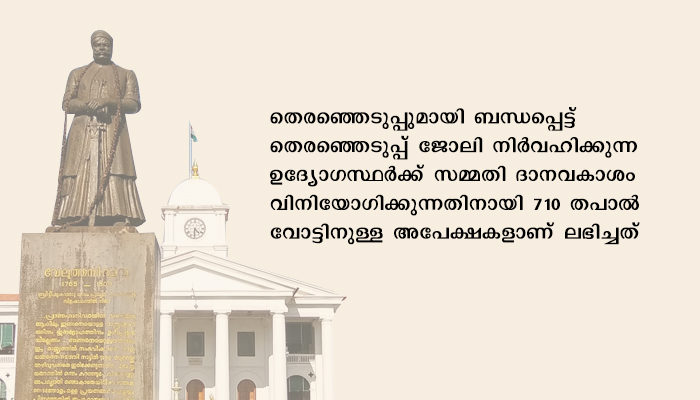 കോഴിക്കോട്: തെരഞ്ഞെടുപ്പുമായി ബന്ധപ്പെട്ട് തെരഞ്ഞെടുപ്പ് ജോലി നിര്വഹിക്കുന്ന ഉദ്യോഗസ്ഥര്ക്ക് സമ്മതി ദാനവകാശം വിനിയോഗിക്കുന്നതിനായി 710 തപാല് വോട്ടിനുള്ള അപേക്ഷകളാണ് ലഭിച്ചത്. തെരഞ്ഞെടുപ്പ് ജോലിക്ക് നിയമിതരായ ഉദ്യോഗസ്ഥര്ക്കുള്ള പോസ്റ്റല് ബാലറ്റുകള് അവര് സമര്പ്പിക്കുന്ന 15ാം നമ്പര് ഫോറവും അതോടൊപ്പമുള്ള അവരുടെ നിയമന ഉത്തരവും ലഭ്യമാവുന്ന മുറയ്ക്ക് പോസ്റ്റല് ബാലറ്റുകള് അതത് റിട്ടേണിംഗ് ഓഫീസര്മാര് നേരിട്ടോ, തപാല് മുഖേനയോ കൈമാറും. പ്രസ്തുത ബാലറ്റുകള് വോട്ടെണ്ണല് ദിവസം (ഡിസംബര് 16) വോട്ടെണ്ണല് ആരംഭിക്കുന്നതിന് (രാവിലെ 8 മണി) മുന്പ് വരെ സ്വീകരിക്കും.